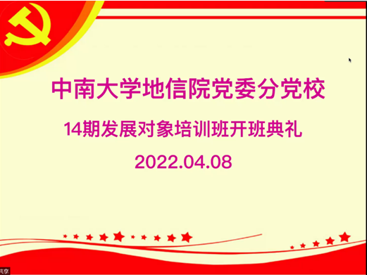 20224821:00,地信院第14期发展对象开班典礼在腾讯会议平台上线上召开。本次开班典礼由培训班班导师杨通田老师主持,地信院党委副书记兼院党委分党校校长李建军老师、地信院党委分党校第45期积极分子培训班班导师杨晨雨老师出席会议,出席学员共67名。