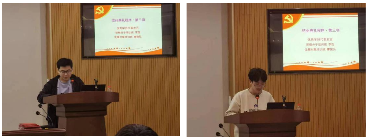 典礼第二项:积极分子培训班李现、发展对象培训班廖俊两位同学弘作为优秀学员代表进行发言。李现、廖俊弘同学分别分享了他们从党课中学到的理论知识及自己的学习体会,鼓励同学们在新时代中勇于担当,用实际行动诠释报国之志。
