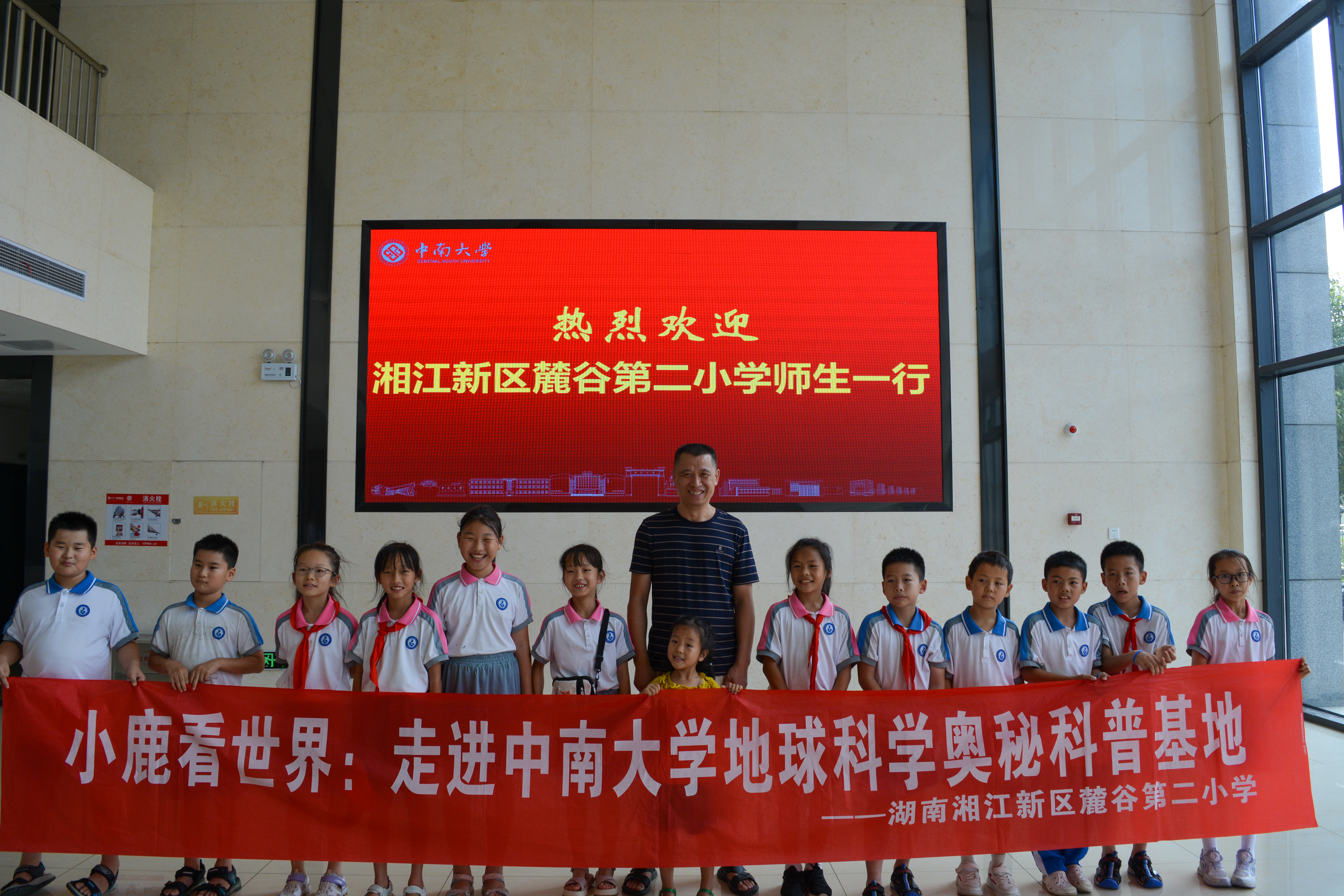 所有场馆参观完毕后,基地的老师们与长郡双语实验中学及湘江新区麓谷小学的孩子们回到了地球科学楼大厅并合影留念。基地由衷希望利用空闲时间来参观学习的孩子们能够在这次“行走的课堂”中发掘并感受到地球科学本身的魅力,也希望通过此次科普参观,激发他们对自然的热爱、对科学的向往!