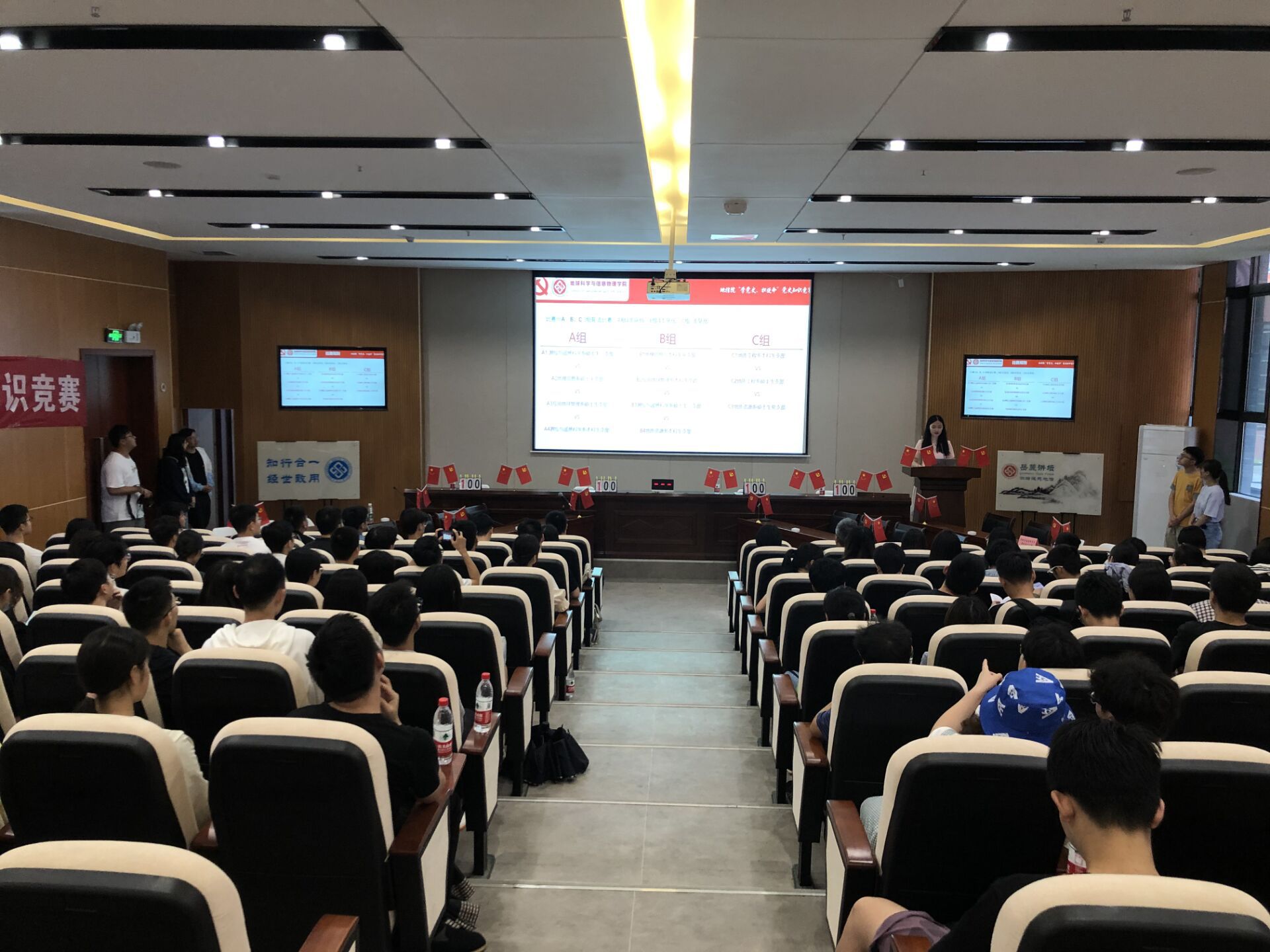11支参赛队伍抽签后根据抽签结果分为A、B、C三组进行对决,竞赛环节依次为必答题、选答题、抢答题和风险题,答题后对分数进行统计,最后根据总分数的高低确定各队伍排名。每位同学都做了充足的准备,熟背四史与党章党规,党史里的每一个里程碑和每一处重要的细节,大家都记得十分清楚,在竞赛中纷纷展示出自己的博学与才华。现场比赛十分激烈,这不仅是对大家党史了解情况的考验,同时也是对团队配合默契度的考验。各队伍积极抢答,认真思考,慎重抉择,考量风险,一番激烈的角逐让在场的观众屏息凝神,欢声雷动。