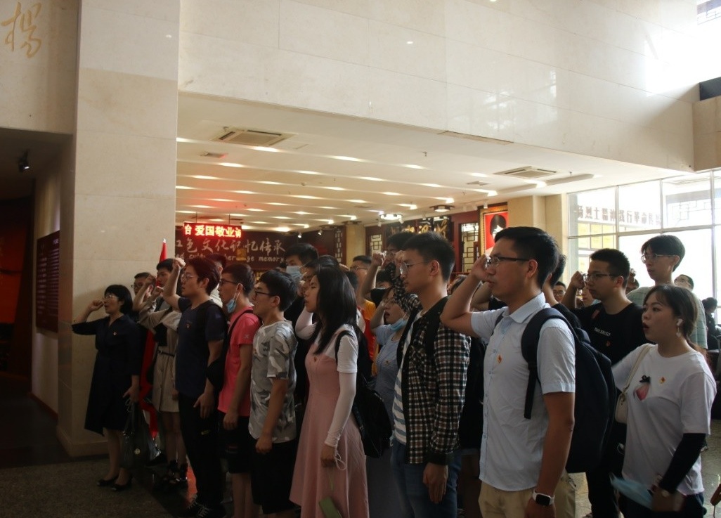 参观杨开慧纪念馆后,地质资源系本科生支部、地质工程系本科生支部全体同志面向党旗,在杨晨雨老师的带领下,重温入党誓词,表明自己加入中国共产党的决心。