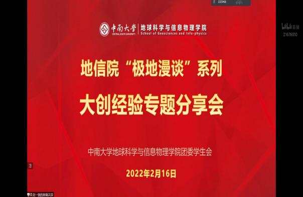 团委学生会特别邀请经验丰富的老师及同学举办“极地漫谈”系列活动——大创经验专题分享会。本次活动于2022年2月16日下午进行直播分享,直播在地信院团学会官方B站账号“blingbling地信君”线上进行,总人气达4684人次,获得了老师及同学们的一致好评。