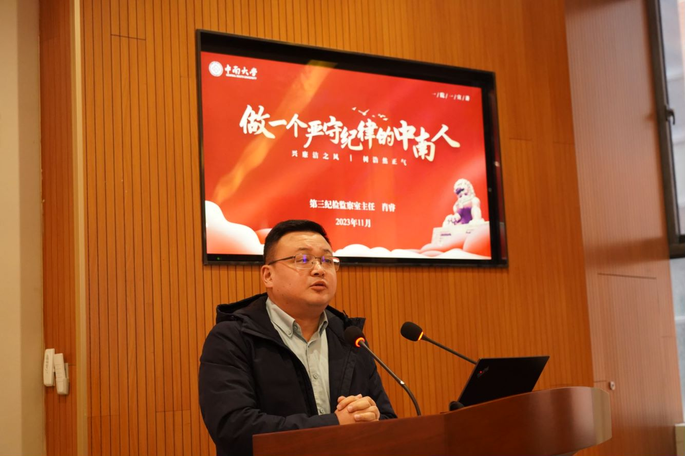 肖睿主任从“保持清醒头脑,自觉遵守廉政‘红绿灯’”“明纪知纪守纪,从紧从严从实恪守纪律”“强化责任担当,营造风清气正发展环境”三个主要方面展开主题宣讲,他结合真实的反腐警示案例,重点为学院教职工阐明、解析了政治纪律、组织纪律、廉洁纪律、群众纪律、工作纪律、生活纪律等六大纪律的基本内涵、负面清单、违反纪律的具体表现,为老师们应该如何严格遵守六大纪律提出了正确、清晰的指导意见及要求。他强调,全体教职工要懂规矩、守纪律、严自律,提高政治站位,强化责任担当,树牢廉洁意识,坚守廉洁底线,防微杜渐,坚决杜绝腐败现象,营造风清气正的学校发展环境,做一个严守纪律的中南人。