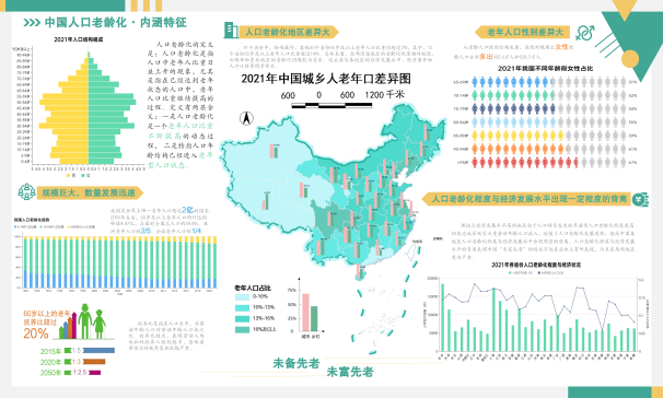 一等奖作品以中国人口老龄化为研究主题,从老龄化内涵特征、原因探索和应对措施三个方面制作了一套风格一致的系列地图,作品很好地呈现了地图的科学性和艺术性,展现了成人直播平台