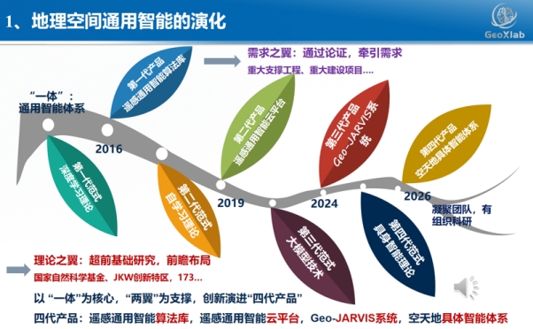 李教授引入“一体两翼”展开介绍,他指出,地理空间通用智能以通用智能体系为核心,以重大支撑工程和建设项目等牵引需求之翼,以超前基础研究与前瞻布局等支撑理论之翼,共同创新演进了四代产品——遥感通用智能算法库、遥感通用智能云平台、Geo-JARVIS系统和空天地具体智能体系。