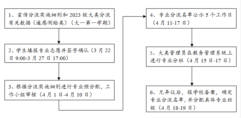 按照本科生院的工作安排,大类内专业分流工作从3月22日填报志愿开始,至4月17日公示结束,19日本科生院更新分流学生学籍信息,工作流程具体如下: