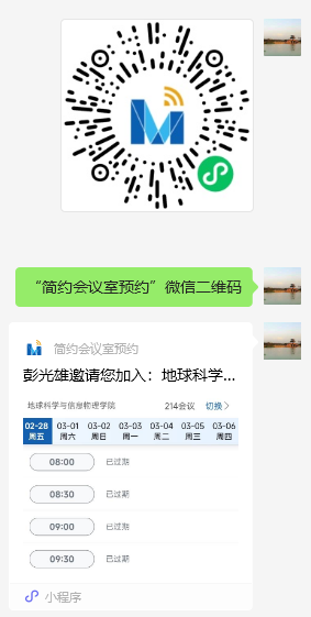 1.统一使用学院发送的“简约会议室预约”微信小程序(或扫码)进行预约登记,会议室基本情况和使用说明分别见附件1和附件2