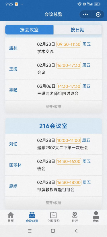 5. 点击“会议总览”,可以“按会议室”或“按日期”查看会议预约情况;