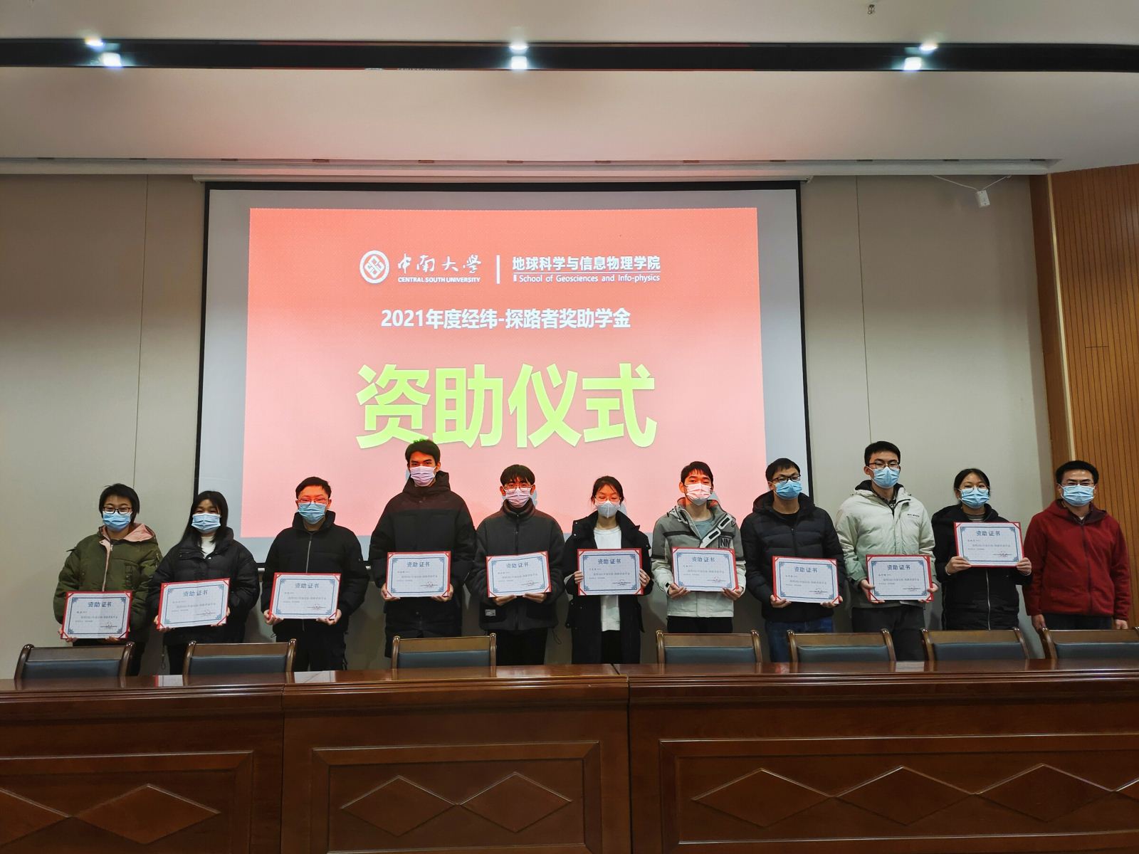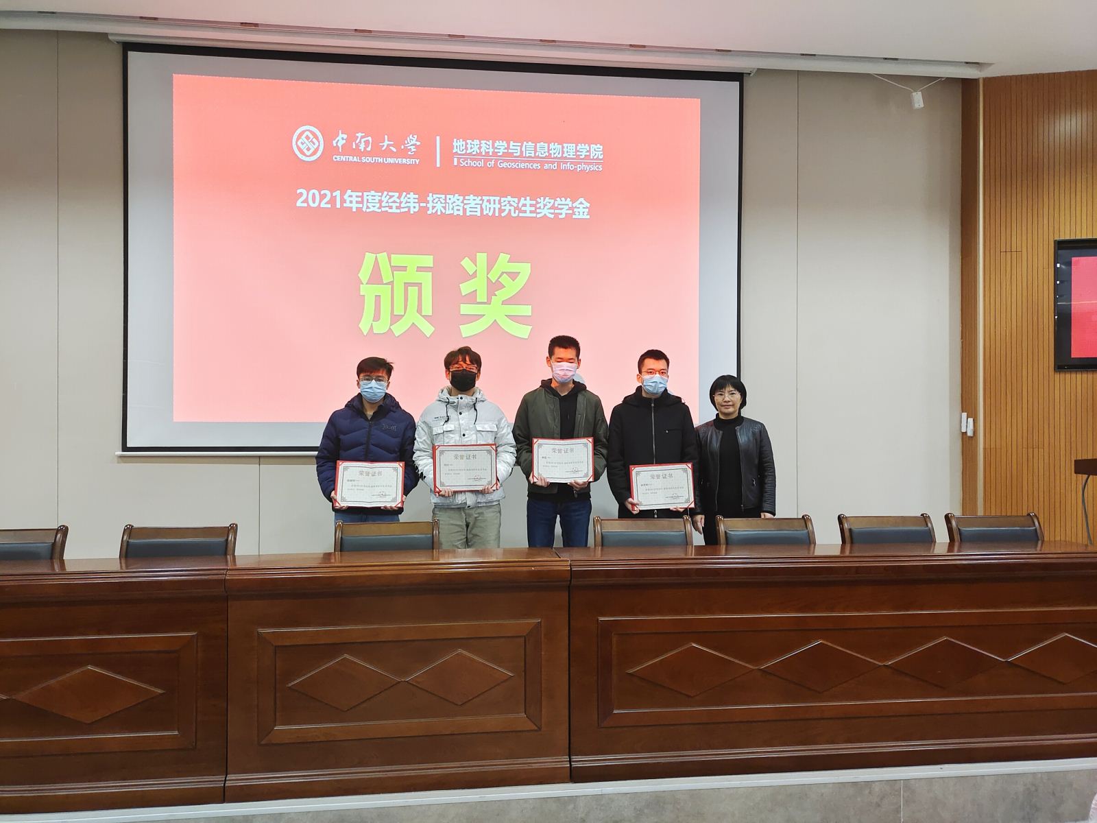 2021年度经纬-探路者奖学金获得者及受资助学生名单,共计博士研究生两人,硕士研究生两人,本科生获一等奖六人、二等奖十人共十六人,助学金获得者共十人。名单宣读后,李建军副书记、李志伟副院长、匡翠林老师和邓吉秋老师为获奖学生颁奖。