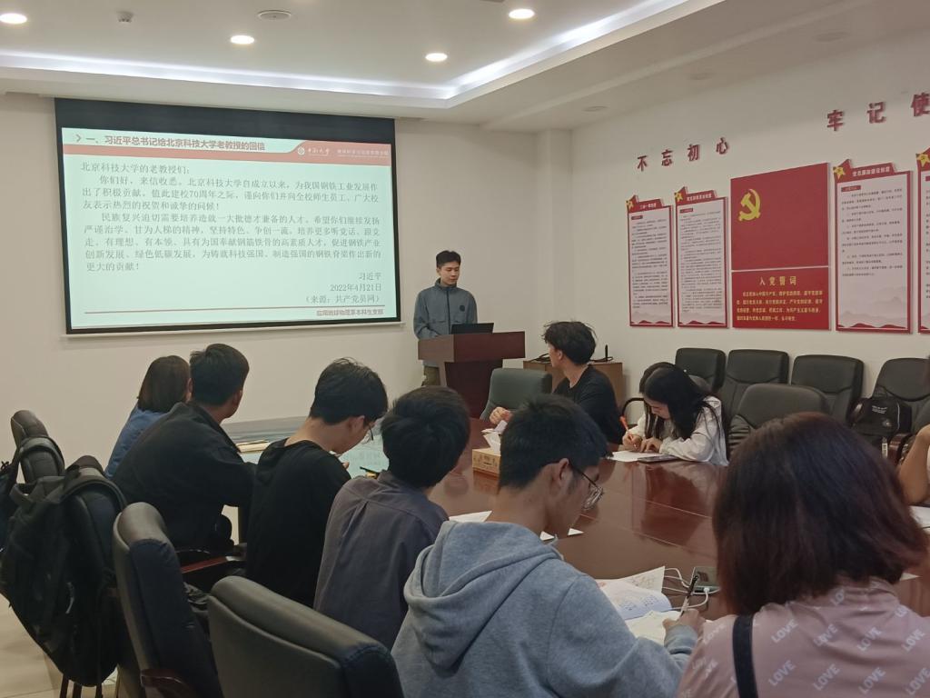 会议第一项,王浩然和徐晨同志带领同志们进行了五月的党课学习,学习内容主要分为两个部分。学习开始,王浩然同志带领支部同志阅读了习近平总书记给北京科技大学老教授的回信和致首届全民阅读大会举办的贺信。之后,王浩然同志带领支部同志观看《携手迎接挑战,合作开创未来在博鳌亚洲论坛2022年年会开幕式上的主旨演讲》与习近平总书记在海南考察时发表的重要讲话的两个新闻视频,支部的每位同志都收获颇多。
