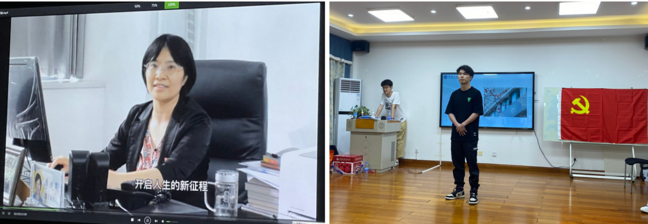 活动第四项,观看支部为18级毕业生党员制作的祝福视频。视频中,学院党委副书记李建军老师送出了对支部18级毕业党员们深切的寄语,支部书记杨通田同志、彭璐同志以及低年级同志也纷纷表达了对18级毕业党员们的祝福。刘志航、赵倩雯、周逸啸同志代表18级毕业同志发言,表达对学弟学妹和支部精心准备活动的感谢,并鼓励学弟学妹们一起奋斗,永远珍存支部情在心中。