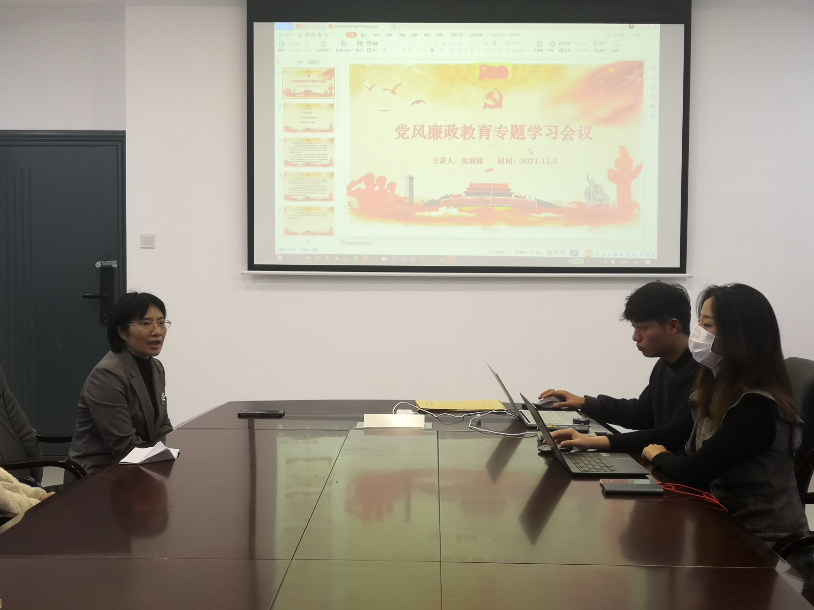 会议伊始,全体支部同志共同学习了党风廉政教育的相关内容。包括了解纪检委员的职责、深入学习《关于严肃换届纪律加强换届风气监督教学讲座》、《完整解读2021关于加强对一把手和领导班子监督的意见》、《中国共产党纪律处分条例》(修改版)等文件精神。接着,由沈羽翔同志传达了学校纪委召开的警示教育大会精神,大会指出,要高度重视党风廉政建设工作,大力推进反腐败斗争,加强反腐办案的力度和对案件的曝光度,以案促改,以案促建,坚决做到零容忍、高压反腐,全面落实从严治党,锲而不舍营造风清气正的政治生态。