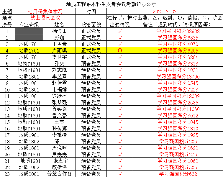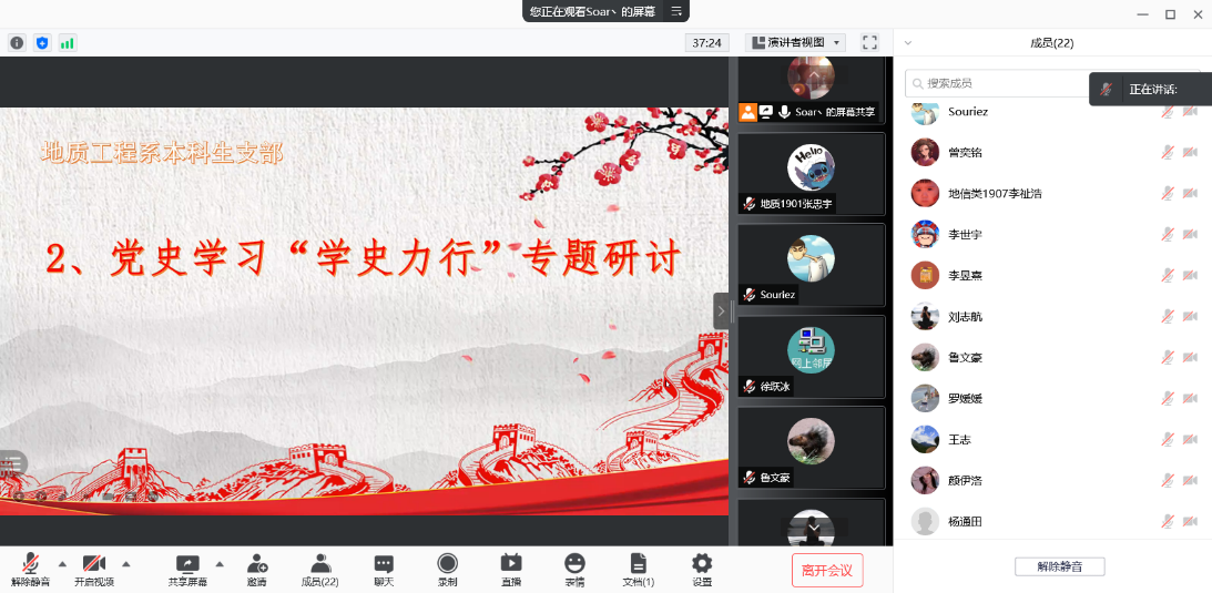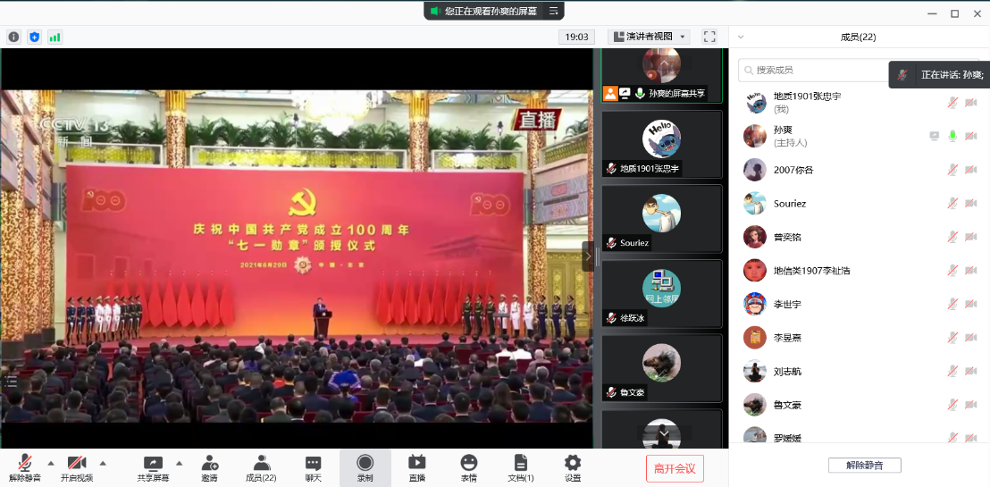 7月27日晚19点,地质工程系本科生支部通过腾讯会议平台顺利开展7月主题党日活动。尽管多数同志还在野外实习,但每位同志仍然克服不利条件悉数参加本次会议。会议由第三党小组组长孙爽同志主持。