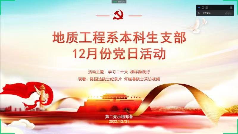 2022年12月31日下午14时,地信院地质工程系本科生支部于线上腾讯会议开展了“学习二十大 榜样励我行”十二月党支部党日活动。会议由第二党小组组长齐国恒同志主持,支部书记杨通田、支部全体同志参加本次支部大会。