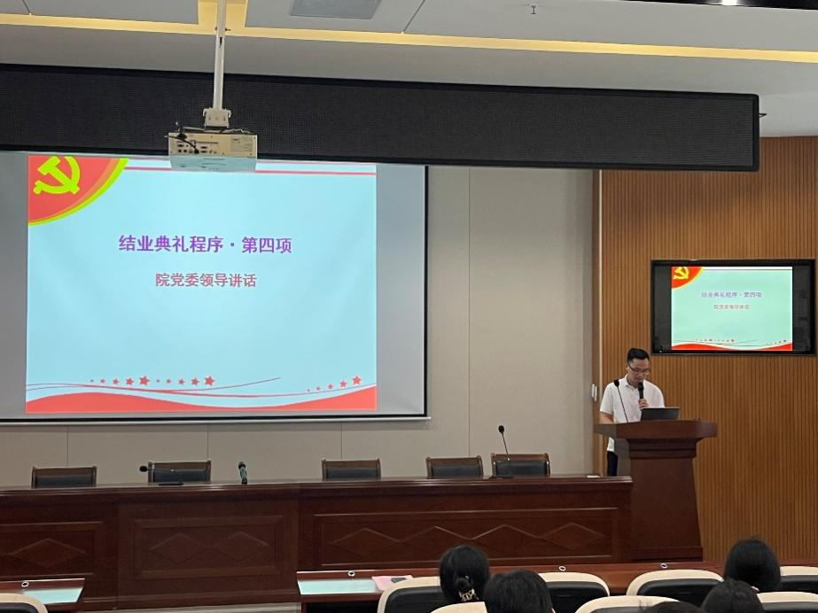 典礼第四项:院党委领导讲话。学员代表发言结束后,杨通田老师受院党委领导委托讲话。他首先对培训班的基本工作表达了肯定,同时也对学员们表达殷切的期望,希望同学们以共产党员标准严格要求自己,争取早日入党。