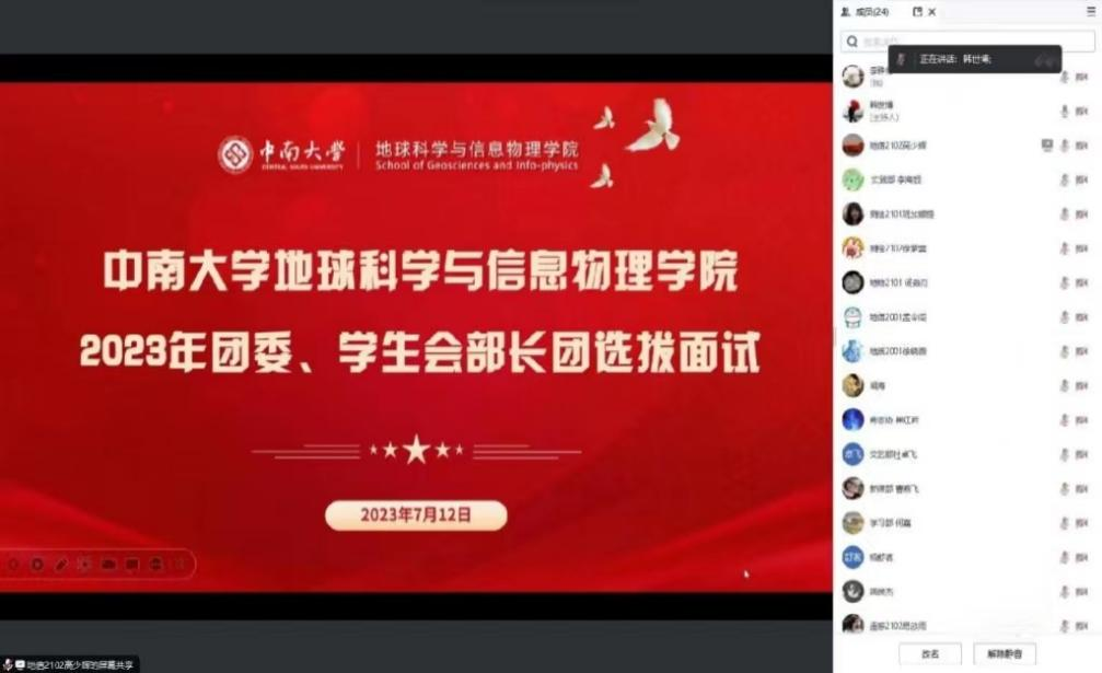 2023年团委、学生会部长团选拔面试在线上顺利举行。院分团委书记刘琦出席活动并担任评委,活动由韩世博同学主持。