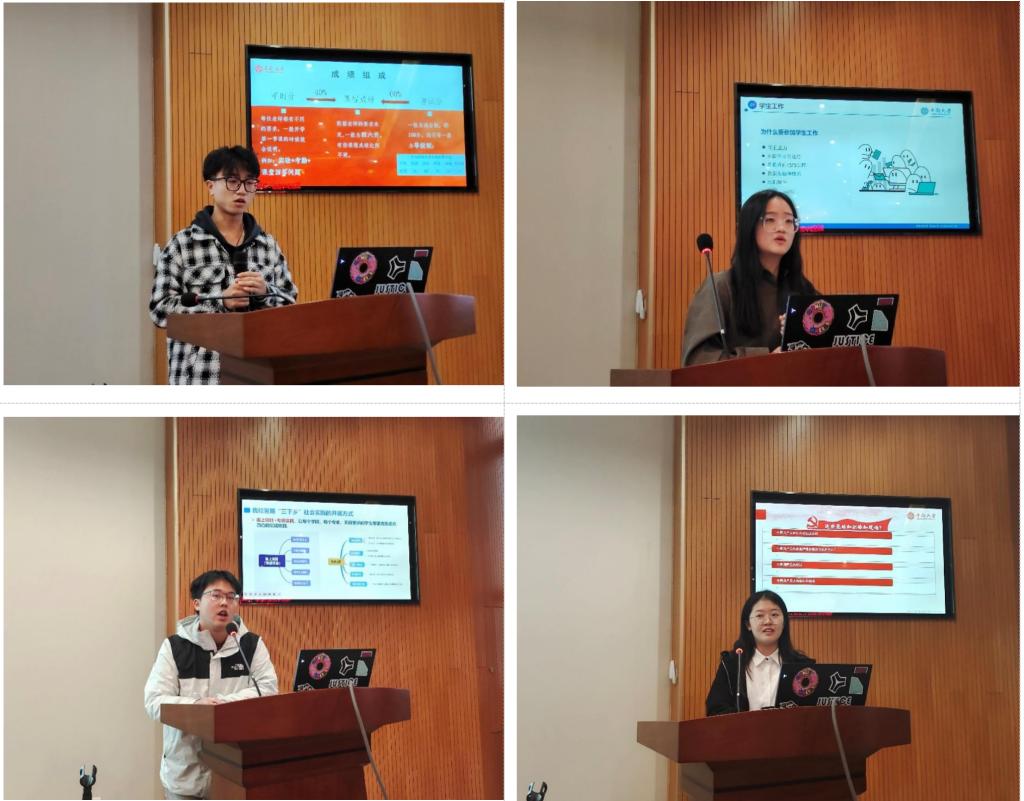 各项社会实践项目,并详细讲解了申报流程、注意事项,并结合自身创建的项目分享了心得。孟璇同学围绕端正入党动机、发展党员需要递交的材料、材料审查等工作环节,对发展党员工作作了详细介绍。