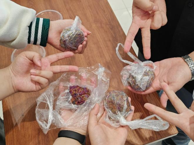歌唱表演结束后,各族同学、老师们在壮族同学的帮助下,伴随着山歌,共同表演起了竹竿舞,竹竿一起一落,舞姿一开一合,将民族青春活力展现得淋漓尽致。随后,在壮族同学的指导下,活动参与者开始现场制作小香囊,小小的香囊包裹着春日繁花的幽香,也包裹着壮族人民的乡土浓情,更包裹着民族大团结的无限柔情。活动成员和壮族同学共同享用了五色糯米饭,糯米飘香,色彩绚丽,每一位同学、老师脸上都洋溢着来自三月三节日的春光,尽情领略浓厚的壮族风情。最后,在同学们的欢歌载舞中,本次活动也迎来了尾声。