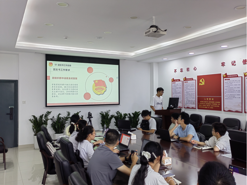 培训正式开始,刘焕东同学分别从团支书工作职责、能力要求、日常团务工作三个方面展开介绍。会议围绕“团日活动如何开展”展开培训,详细介绍了团日活动的开展流程与注意事项,及“百强”团日活动创新大赛的具体要求和团日活动总结书写要求。在最后的“智慧团建系统如何操作”部分,刘焕东同学结合实际操作界面,系统讲解了网上共青团系统的操作步骤,引导新生团支书开展新生网上团组织关系转入工作。