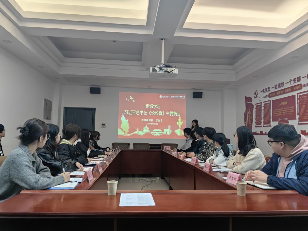 学生会临时团支部于地科楼216组织学习了习近平总书记《论教育》主要篇目,会议由院学生会办公室部长尹语妍同学主持,21名学生干部参会。