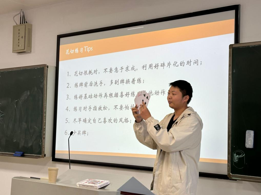 活动伊始,魔术社社长覃思源欢迎辞,对新成员的加入表示热烈欢迎,并简要介绍了社团的发展历程宗旨。随后,社长对纸牌魔术和花切的基本知识进行了简单介绍并附上视频供大家欣赏学习。覃同学提到,魔术社不仅是一个学习魔术技巧的平台,更是一个培养创造力、表现力和团队合作精神的大家庭,魔术这艺术需要大家齐心协力地传播和发扬。