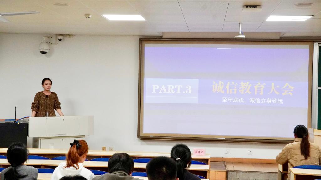 随后,寇浚哲老师围绕诚信应考教育与日常管理细则做了介绍补充。寇老师结合学校学生纪律处分条例和真实案例,提醒同学们务必诚信应考,以真实水平检验学习成果。在日常事务管理方面,寇老师对课程和外出请假的规范流程及晚报平安和晚熄灯管理要求进行了重点解读。