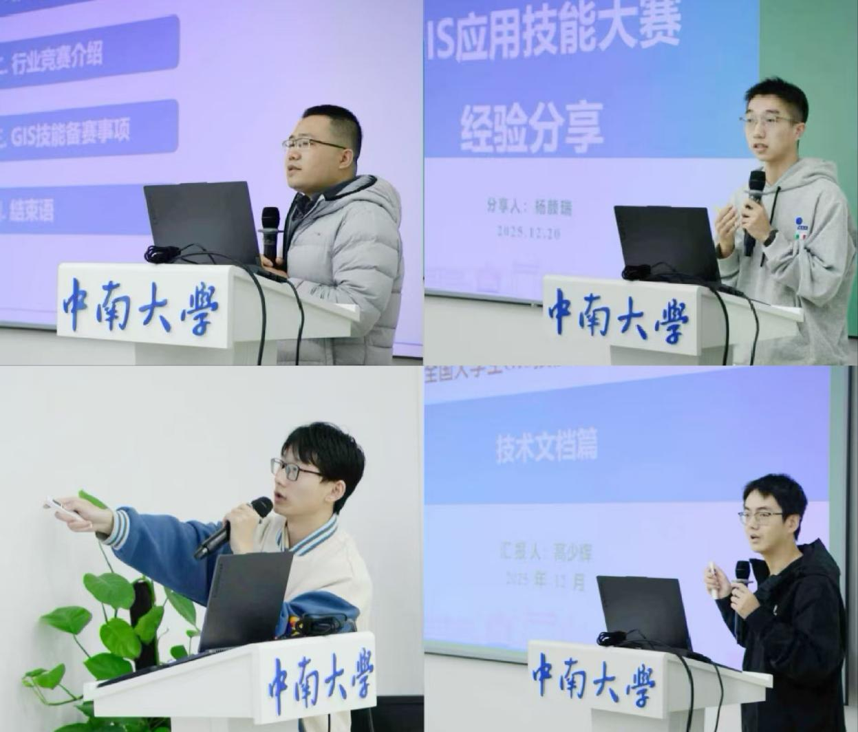 副教授、博士生导师、地理信息系副主任侯东阳老师及在往届大赛中取得优异成绩的杨颜瑞、孟令闯、高少辉三位同学进行分享。