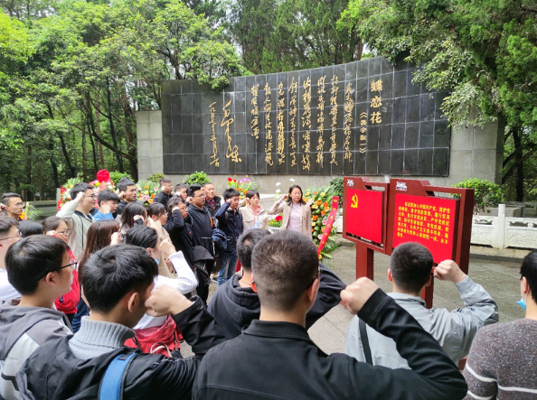 首站,支部成员来到位于长沙县的杨开慧故居。在庄严的烈士纪念碑之后,安然栖息着杨开慧烈士。这里没有市区的喧嚣,只有苍翠的松柏傲然挺立,络绎不绝前来瞻仰的人群和碑前的鲜花表明杨开慧烈士从未被忘记。在支部书记王文卉同志的带领下,支部全体成员面对杨开慧烈士墓三鞠躬,以表达对杨开慧烈士的缅怀之情。鞠躬后,王文卉带领大家重温入党誓词,勉励大家要做到永远不忘共产党人的初心,牢记共产党人的担当使命。