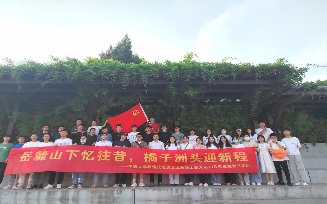 2022年10月23日下午14: 00—17: 00,地信院地质资源系硕士生党支部在橘子洲开展了以“岳麓山下忆往昔,橘子洲头迎新程”为主题的党日活动。旨在通过本次党日活动深入学习贯彻中国共产党第二十次全国代表大会精神,缅怀伟人丰功伟绩,传承革命先辈伟大精神,同时让支部同志在学习科研之余参加户外活动,以促进支部同志间的交流和沟通,丰富校园文化生活,增强支部凝聚力和战斗力。党支部全体党员、发展对象及积极分子共计39人参加了本次主题党日活动,支部书记康逊老师莅临指导。