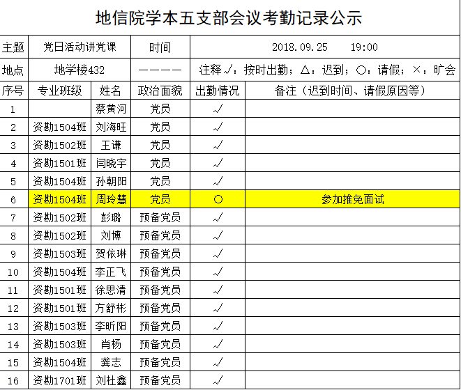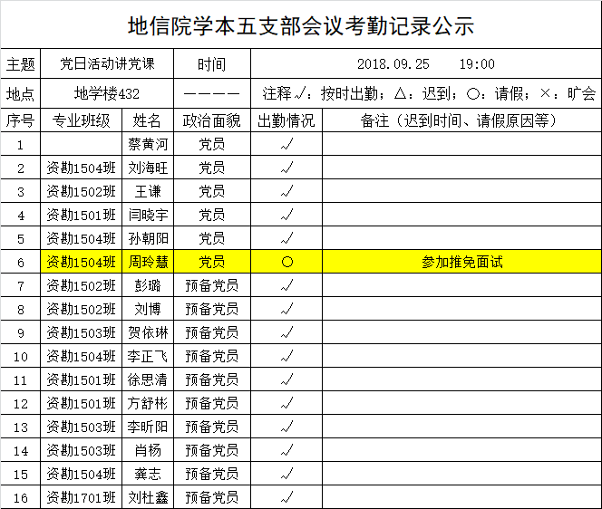 2018年9月25日地信院学本五支部会议考勤公示