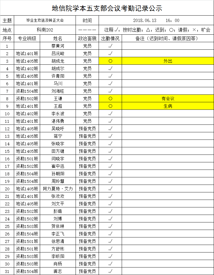 2018年6月13日下午,地信院学本五支部召开支部党员大会,开展党日活动欢送毕业生党员并进行预备党员转正大会。将出勤情况公示如下,接受党内外群众监督。
