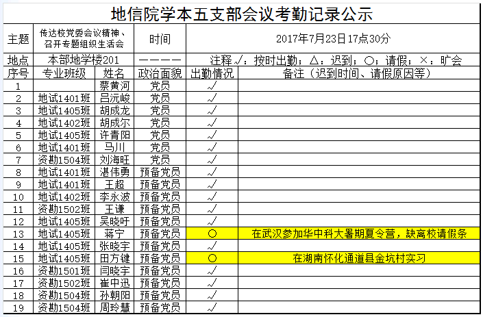 2017年7月23日地信院学本五支部会议考勤公示