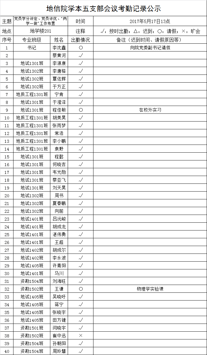 2017年5月17日中午,地信院学本五支部召开工作布置会。将出勤情况公示如下,接受群众监督。