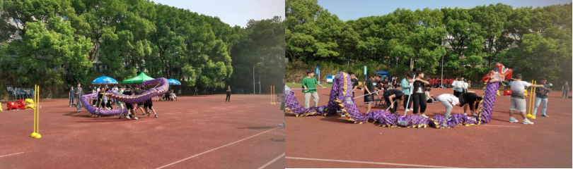 比赛过程中,勇猛的“狮子”、灵动的“巨龙”在赛场上穿梭,铿锵有力、热闹非凡的锣鼓阵阵响起,“准备、起、走、落”,一次次呐喊,齐声口号与激昂音乐交汇,奏响起舞龙舞狮的乐章,一条条锦色长龙在操场上翻腾起舞,各个队伍纷纷亮出绝技,都在努力取得更好的成绩,为学院争光。